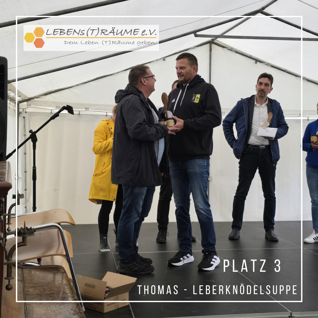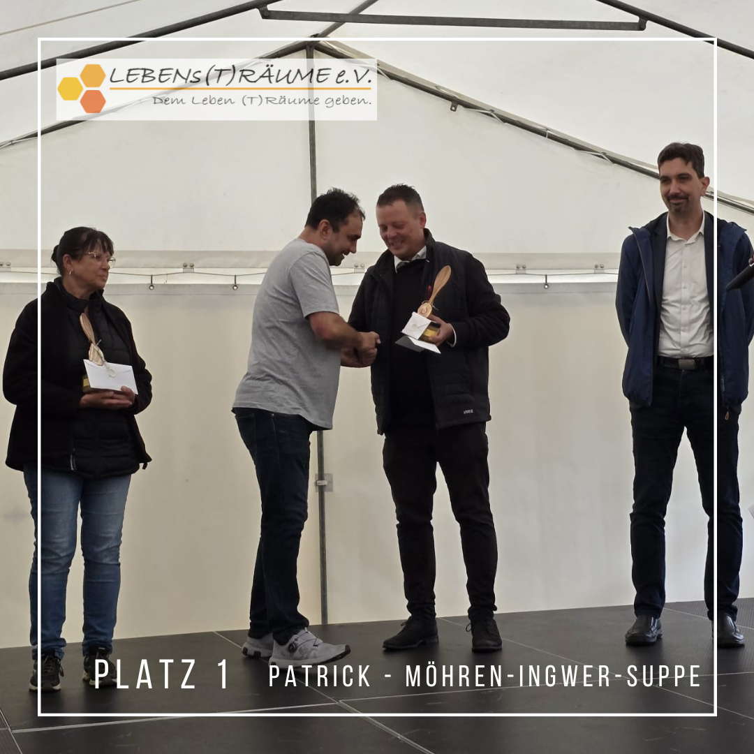 Auf Platz 3 landete Thomas mit seiner Leberknödelsuppe. Platz 2 belegte Erdmute mit ihrer Zucchinicremesuppe und Platz 1 und Titelverteidiger mit der Möhren-Ingwer-Suppe und damit Suppenkönig 2025 ist Patrick!